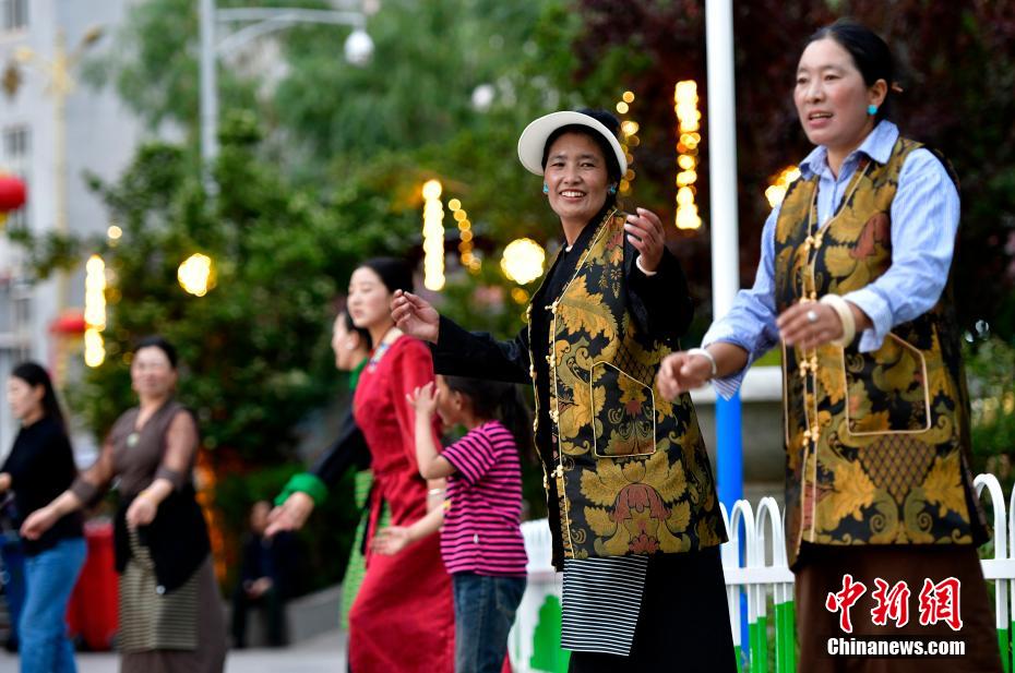 7月13日,西藏昌都瀾滄江天津廣場上,鍋莊舞愛好者踏歌起舞,舞出夏日夜間精彩。中新社記者 李林 攝