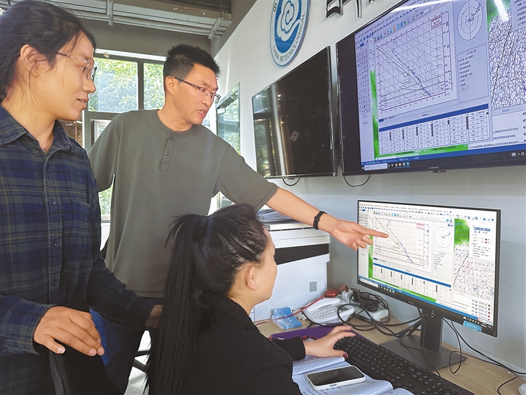 潘貴元(中)和同事討論氣象業(yè)務工作。記者 周婷婷 平措郎加 攝