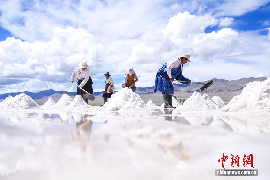 7月20日,在西藏阿里地區(qū)革吉縣鹽湖鄉(xiāng),民眾在鹽湖中采制粗鹽巴。一千多年前,阿里地區(qū)有50多家駐扎的鹽幫,將自然鹽用羊馱牛背邊放牧邊運(yùn)輸?shù)姆绞?,運(yùn)送到普蘭、日喀則、印度、尼泊爾等地,并用以物易物的方式換回青稞、磚茶、布料等日常生活所需的物品,從而孕育了遠(yuǎn)負(fù)盛名的“鹽羊古道”傳奇。近年來(lái),當(dāng)?shù)亻_(kāi)辦粗鹽巴加工廠、打造“鹽羊古道”旅游品牌等方式,使千年“鹽羊古道”煥發(fā)新生機(jī)。中新社記者 張祥毅 攝