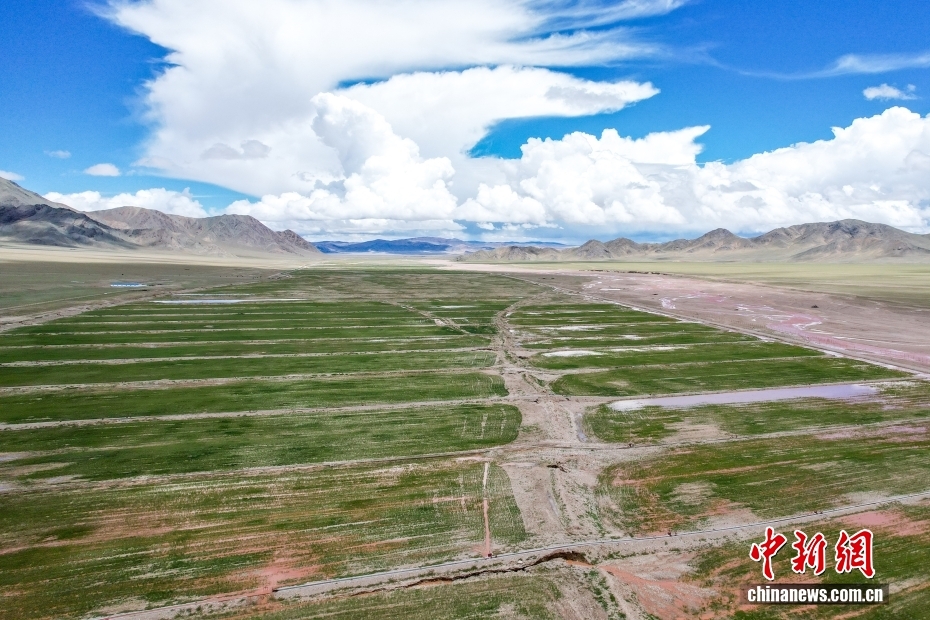 7月20日,航拍西藏阿里地區(qū)革吉縣文布當(dāng)桑鄉(xiāng)的人工種草基地。為解決當(dāng)?shù)囟旧笥貌堇щy,減輕天然草場壓力,2016年起文布當(dāng)桑鄉(xiāng)規(guī)劃建設(shè)人工種草基地。截至2024年,已種植人工草場3590畝,草業(yè)收入229.3萬元人民幣,有效帶動當(dāng)?shù)剞r(nóng)牧民就業(yè)創(chuàng)收和推動生態(tài)可持續(xù)發(fā)展。(無人機照片)中新社記者 張祥毅 攝