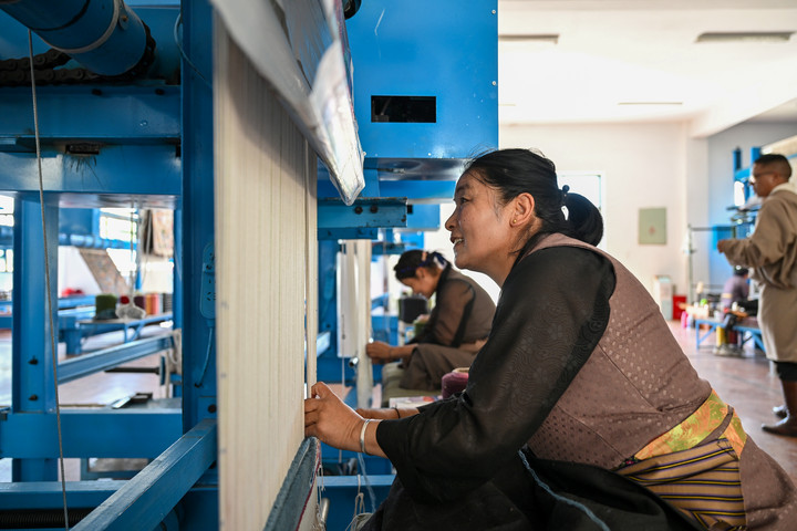 在日喀則市江孜縣的一家藏毯編織車間里,珍拉正盤腿坐在織架前,雙手在密集的經(jīng)線間靈巧地穿梭、挑動、打結(jié),一幅寓意吉祥的大鵬金翅鳥圖案,在她手下逐漸成形。