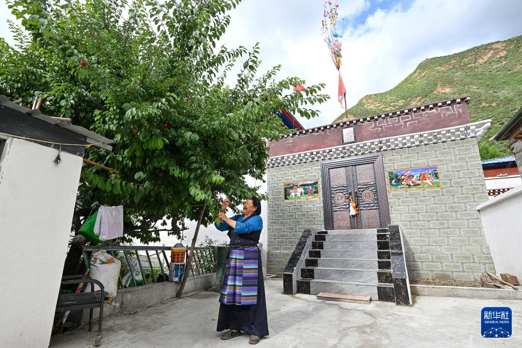 7月21日,63歲的拉丁雪村村民索朗康珠在改造提升后的自家小院內摘李子。新華社記者 李鑫 攝