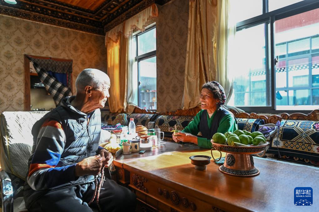 7月21日,58歲的拉丁雪村婦聯主席格桑德青(右)在自家改造提升后的餐廳里給88歲的父親喬多吉削水果。新華社記者 李鑫 攝