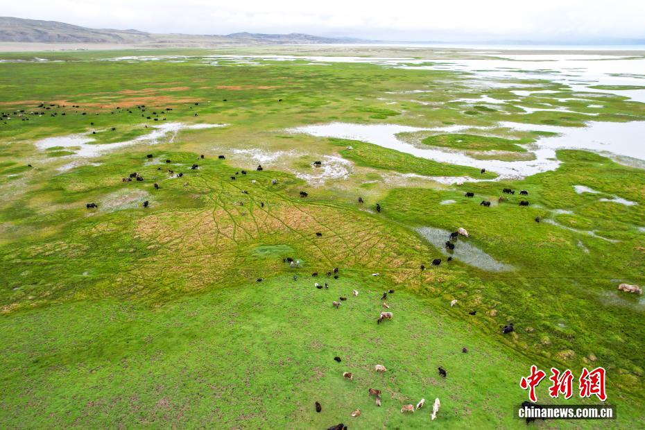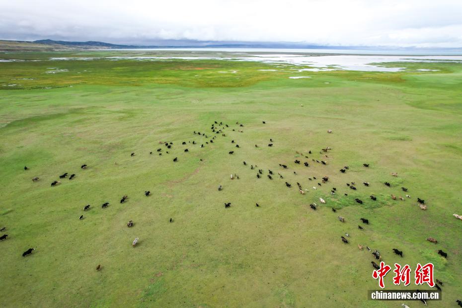 7月22日,在西藏阿里地區(qū)普蘭縣霍爾鄉(xiāng),牧民在瑪旁雍錯濕地上放牧牦牛。為實現(xiàn)更大的經(jīng)濟效益,霍爾鄉(xiāng)近年來探索建立牦牛養(yǎng)殖專業(yè)合作社,按當(dāng)?shù)刈匀粭l件合理分配牦牛放牧地點,并將牛奶進行加工銷售,2023年該合作社的年總收入達到60余萬元人民幣,帶動牧民人均增收2萬余元人民幣。(無人機照片)中新社記者 張祥毅 攝