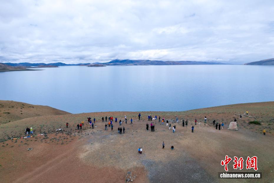 7月22日,游客游覽拉昂錯?,斉杂哄e與拉昂錯位于西藏阿里地區(qū)普蘭縣境內(nèi),兩湖僅有一堤之隔,卻擁有不同的地理特征和咸淡水之分,因而分別被譽為“圣湖”與“鬼湖”。每年夏天,兩湖與附近的岡仁波齊一道,吸引眾多游客前來賞景游覽。(無人機照片)中新社記者 張祥毅 攝