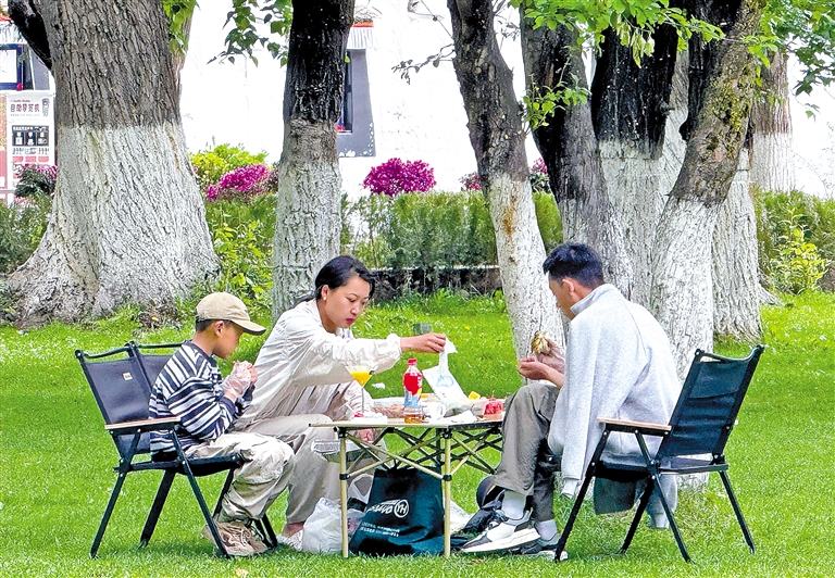正在過林卡的拉薩市民尼珍告訴記者:“我們是自帶折疊椅、食物和茶具,在河邊搭帳篷、過林卡,喝著熱騰騰的酥油茶,看著藍天白云倒映在清澈的溪水中,這種愜意難以用言語形容。”