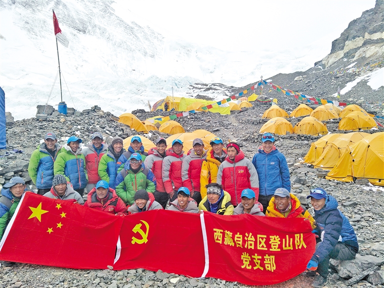 2017年,西藏自治區(qū)登山隊隊員在珠峰腳下舉行主題黨日活動。