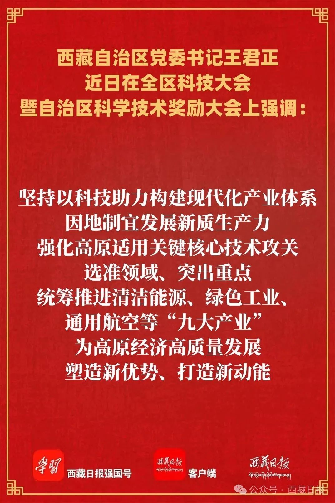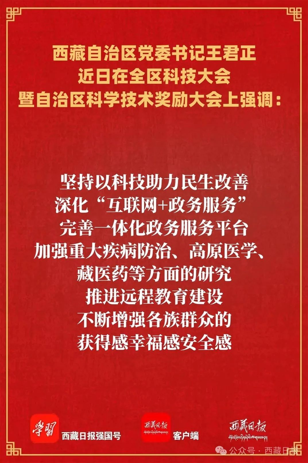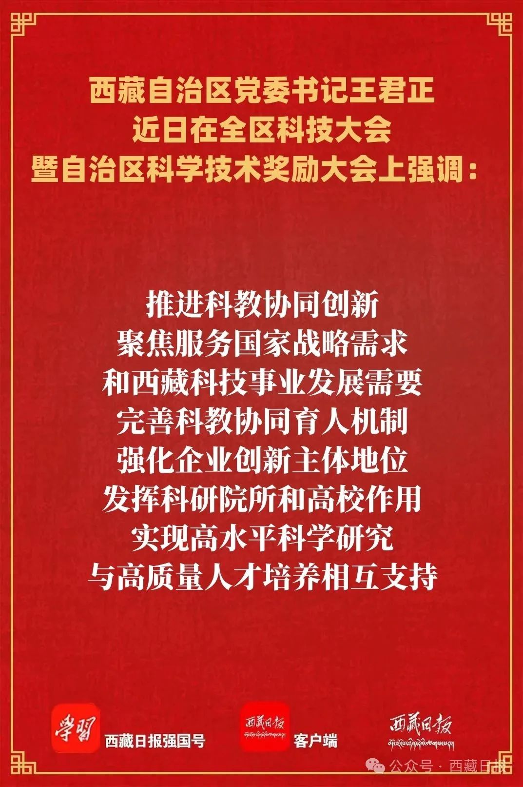 近日,全區(qū)科技大會暨自治區(qū)科學技術獎勵大會在拉薩召開,自治區(qū)黨委書記王君正出席并講話。他強調(diào),要深入貫徹落實習近平總書記關于科技創(chuàng)新、西藏工作的重要指示和新時代黨的治藏方略,加快推動科技事業(yè)發(fā)展,為社會主義現(xiàn)代化新西藏建設提供堅實科技支撐。
