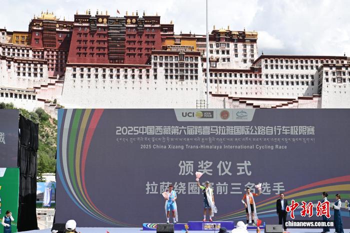 8月9日,2025中國西藏第六屆跨喜馬拉雅國際公路自行車極限賽拉薩賽段(第三賽段)完賽。本賽段為拉薩繞圈賽,起點拉薩市西藏博物館,終點布達拉宮廣場,全程約92.53公里。比賽吸引了來自中國、西班牙、哈薩克斯坦等20余支車隊。圖為斯優(yōu)泰-梵蒂尼職業(yè)隊 RAJOVIC Dusan(中)、快客洲際隊 LAAS Martin(左)、巴斯克電信職業(yè)隊 ABERASTURI IZAGA Jon(右)分別獲得本賽段第一、二、三名。中新社記者 貢嘎來松 攝