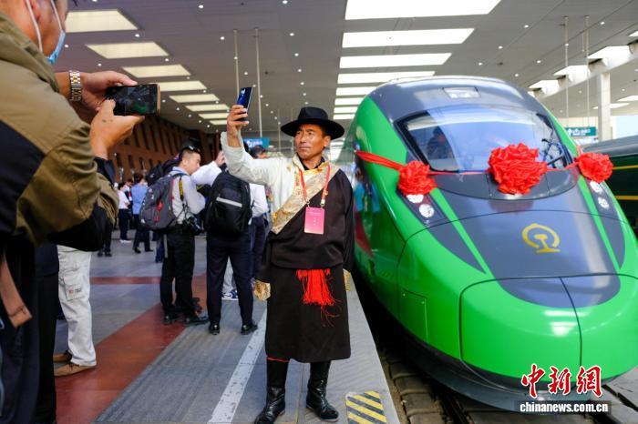 資料圖為2021年6月25日,西藏拉林鐵路開通運營,民眾在拉薩火車站與復(fù)興號拍照留念。當(dāng)日,斯朗旺扎系首發(fā)司機(jī)。中新網(wǎng)記者 江飛波 攝