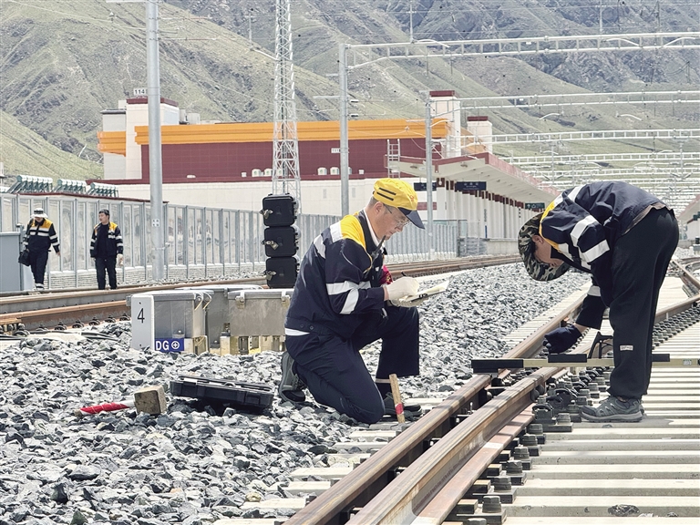 7月29日14時30分,拉林鐵路山南站,馬琳一手持道尺、一手握打號筆,一步一彎腰仔細(xì)檢查線路,額頭上沁滿的汗珠在高原陽光下熠熠生輝。這位已在青藏鐵路線上扎根29年的老線路工,用指腹反復(fù)摩挲著滾燙的鋼軌邊緣——這是他與鐵路對話的特殊方式。