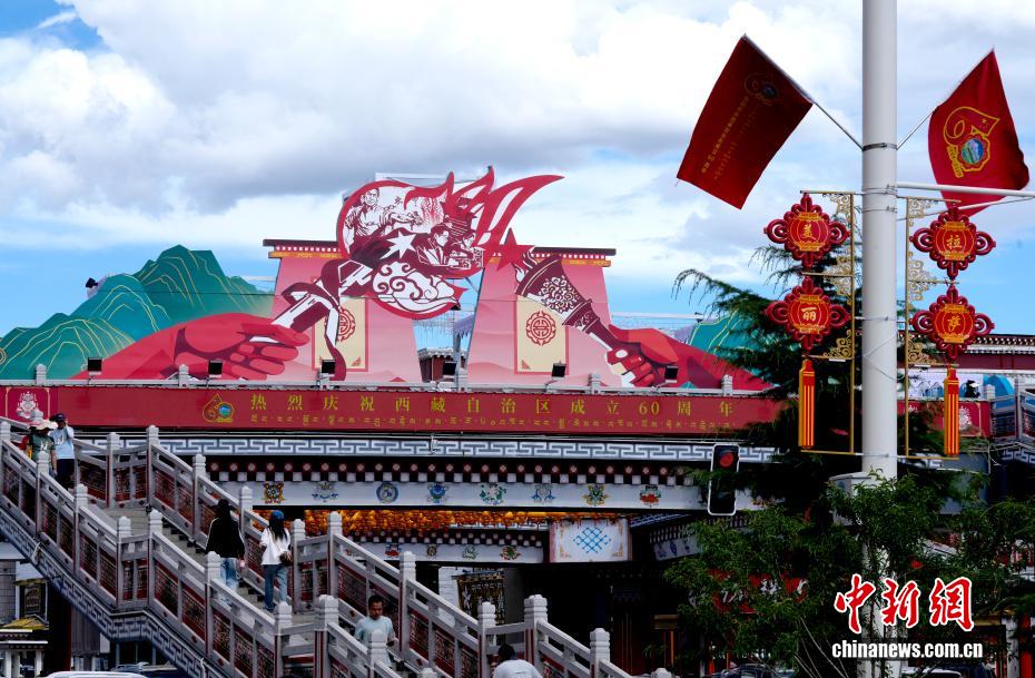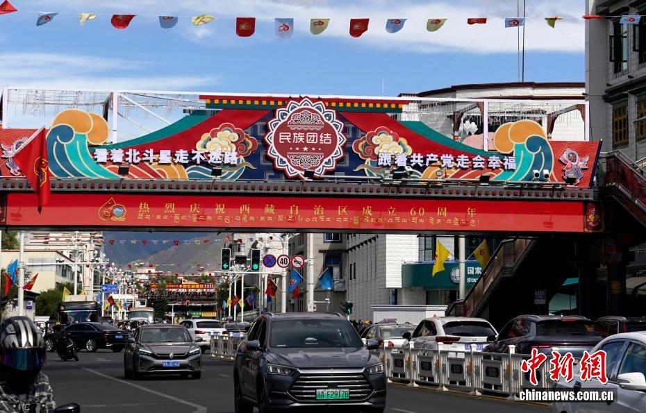 8月19日,隨著西藏自治區(qū)成立60周年慶?;顒优R近,拉薩氛圍濃。拉薩街頭,處處是張燈結彩的盛景,洋溢著一派祥和與歡騰的氛圍。圖為拉薩裝扮一新的人行天橋。中新社記者 李林 攝
