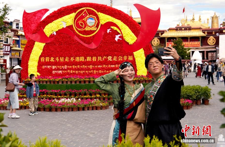 8月19日,隨著西藏自治區(qū)成立60周年慶?;顒优R近,拉薩氛圍濃。拉薩街頭,處處是張燈結彩的盛景,洋溢著一派祥和與歡騰的氛圍。圖為游客在拉薩大昭寺廣場上的大慶宣傳標語前留念。中新社記者 李林 攝