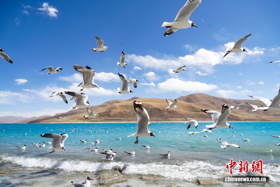 位于西藏自治區(qū)山南市境內的羊卓雍措沿岸水鳥翔集。中新社記者 馬銘言 攝