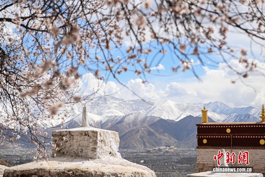 位于西藏拉薩北部山坳里的古剎帕邦喀周圍桃花盛開,吸引眾多游客前來觀光拍照。圖為帕邦喀周圍盛開的桃花和遠處的布達拉宮。中新社記者 貢嘎來松 攝
