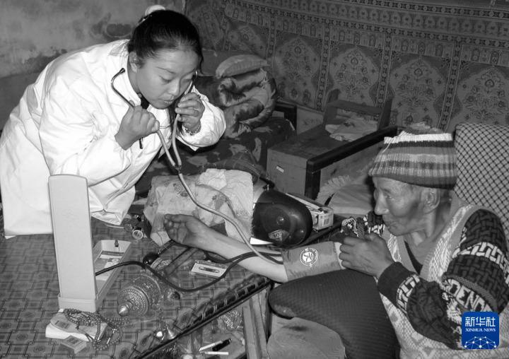 2002年9月13日,青藏鐵路工地的醫(yī)生胡媛媛(左)在為藏族老人扎松檢查身體。自青藏鐵路開工建設以來,鐵路職工積極為沿線藏族同胞解決吃水、看病等問題,為藏族同胞送溫暖。