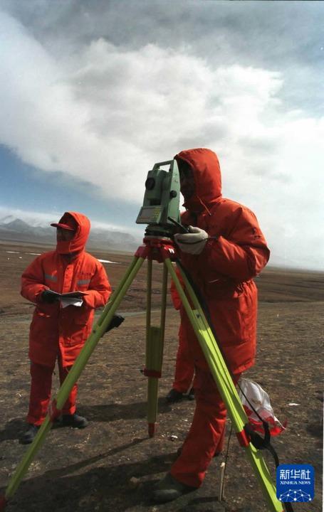2001年4月,勘測人員在海拔近5000米的四道梁加緊進行青藏鐵路的勘測工作。
