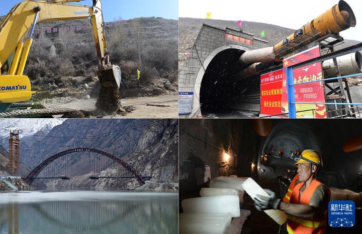 拼版資料左上圖:拉林鐵路西藏桑日縣桑珠嶺隧道開工(2014年12月19日攝);左下圖:施工中的藏木特大橋(2020年4月5日攝);右上圖:拉林鐵路藏嘎隧道施工中(2020年4月5日攝);右下圖:工人把大量冰塊搬進桑珠嶺隧道,用來降溫(2017年4月11日攝)。