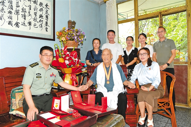 圖為工作人員向抗戰(zhàn)老戰(zhàn)土徐明亮(前排中)頒發(fā)紀(jì)念章。記者 洛?!z