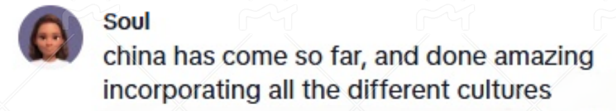 網(wǎng)友@Soul指出,“中國已經(jīng)取得了長足的進步,在融合各種不同文化方面做出了令人驚嘆的成就。”