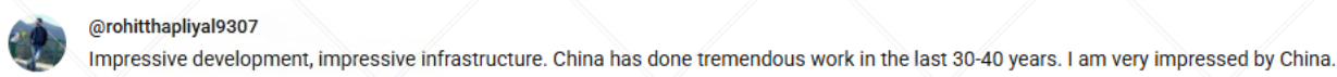 網(wǎng)友@rohitthapliyal9307說道,“多么令人矚目的發(fā)展,多么令人印象深刻的基礎(chǔ)設(shè)施。中國在過去三四十年里做出了巨大的貢獻。我對中國印象深刻?!?/p>