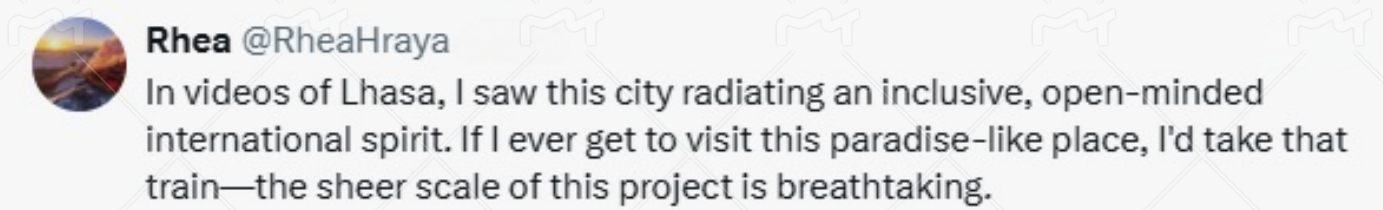 網(wǎng)友@Rhea表示,“在拉薩的視頻中,我看到這座城市散發(fā)著包容、開放的國際精神。如果我有機會參觀這個天堂般的地方,我會坐那列火車——這個項目(青藏鐵路)的規(guī)模令人嘆為觀止?!?/p>