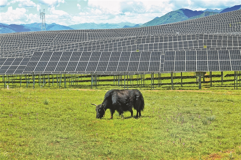 熱瓦鄉(xiāng)熱熱村是典型的牧業(yè)村,位于那曲市索縣的群山峻嶺之間。2023年12月,西藏開(kāi)投集團(tuán)投資建設(shè)的50MW牧光互補(bǔ)儲(chǔ)能項(xiàng)目在這里并網(wǎng)發(fā)電,遠(yuǎn)遠(yuǎn)望去像是山坡上的“藍(lán)色湖泊”。牧民們每天會(huì)趕著羊群來(lái)這里放牧,陽(yáng)光透過(guò)光伏板的縫隙灑在草地上,羊群在陰涼下自由覓食。在光伏板的“庇護(hù)”下,不僅山地植被可以免受烈日大風(fēng)的侵襲,還能對(duì)養(yǎng)殖的動(dòng)物起到保護(hù)效果,在充分利用光能優(yōu)勢(shì)的同時(shí),為鄉(xiāng)村振興注入新動(dòng)能,實(shí)現(xiàn)企業(yè)和農(nóng)牧民雙向受益。