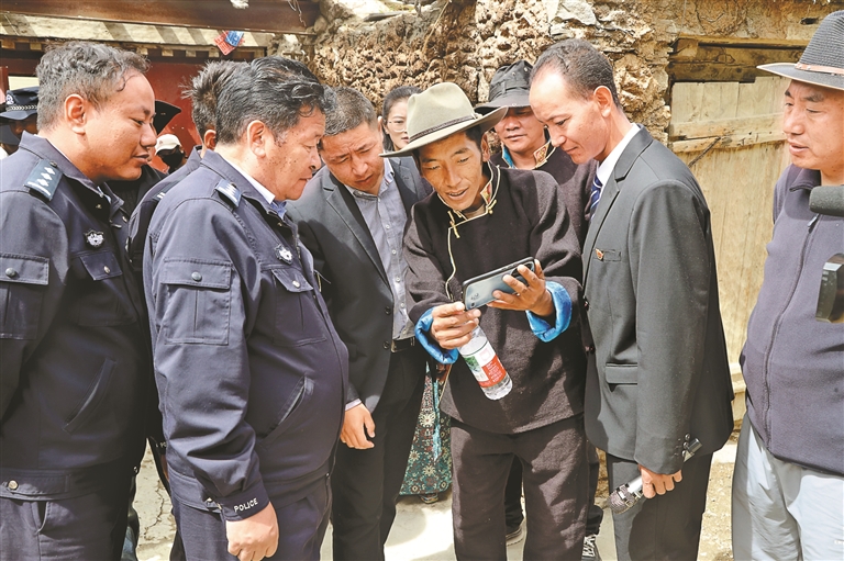 多卻鄉(xiāng)負責人與浪卡子縣公安局民警入戶了解家裝自衛(wèi)探頭運行情況。