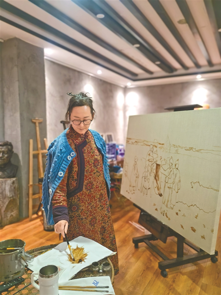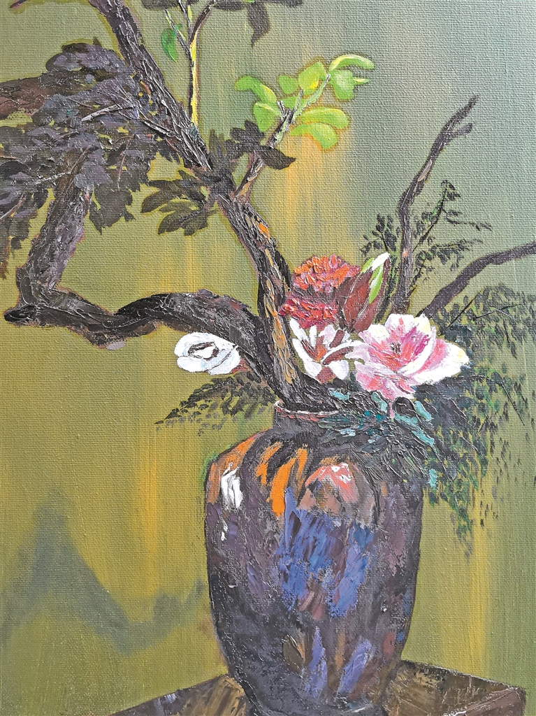 推開羽芊位于拉薩東郊的家門,目光首先被三面通體書墻溫柔捕獲。文學(xué)、歷史、自然、科學(xué),上萬冊藏書如沉默的智者靜立。書柜一角,整齊擺放著《藏婚》《西藏生死戀》《金城公主》等十五部藏地題材作品,每一本都浸潤著高原陽光的暖意。四處打量,書桌旁立著一個畫架,未完成的油畫上,藏北草原斑斕秋色正流淌在畫布上,透露出她對光影與色彩天生的敏銳——這份未被刻意強調(diào)的油畫天賦,悄然浸染著她的文學(xué)世界。