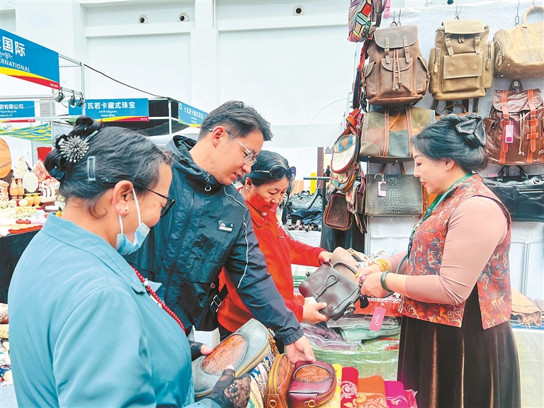 西藏本土特色產品同樣是展會的亮點。在非遺展區(qū),藝人們正向游客傳授唐卡選購技巧;藏式食品銷售區(qū)更為熱鬧,工作人員為游客遞上酥油茶:“趁熱喝,配青稞餅更地道!”不少游客端碗坐在藏式卡墊上,一邊品嘗一邊交流,手中還拿著剛購買的唐卡圖案布袋,神情喜悅。