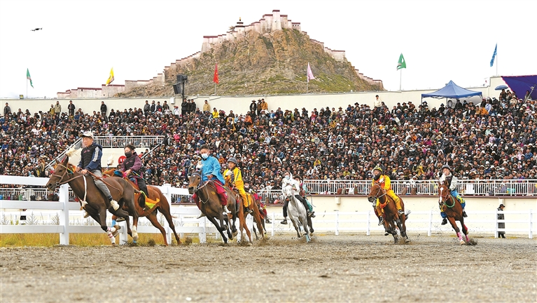 “達(dá)瑪”藏語意為“跑馬射箭”。每年的達(dá)瑪節(jié),賽馬都會吸引十里八鄉(xiāng)的人們前來觀賽。賽馬場上人頭攢動,隨著發(fā)令聲響,一匹匹駿馬如離弦之箭沖出起跑線,騎手俯身貼在馬背上,揚(yáng)鞭馳騁,你追我趕,奮勇爭先。觀眾席上,人們隨著比賽節(jié)奏,時而激動,時而安靜,時而歡呼,時而嘆息。藏族阿媽次仁卓嘎難掩激動,她告訴記者,幾乎每年都會和家人來看賽馬。賽場上,選手們堅韌不拔、昂揚(yáng)向上的精神風(fēng)貌讓人動容,也激勵著一代又一代英雄城兒女為祖國發(fā)展繁榮而不懈奮斗。