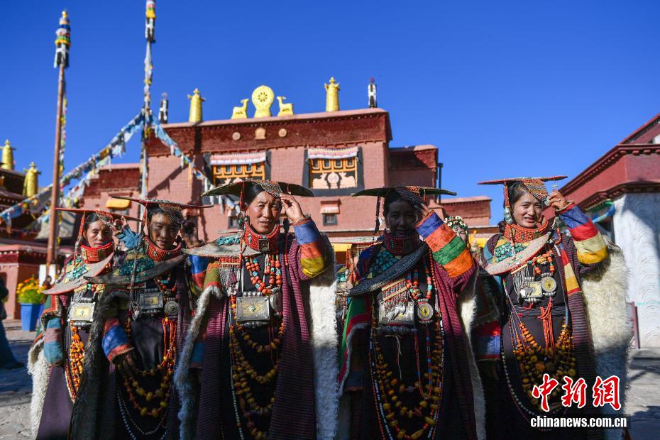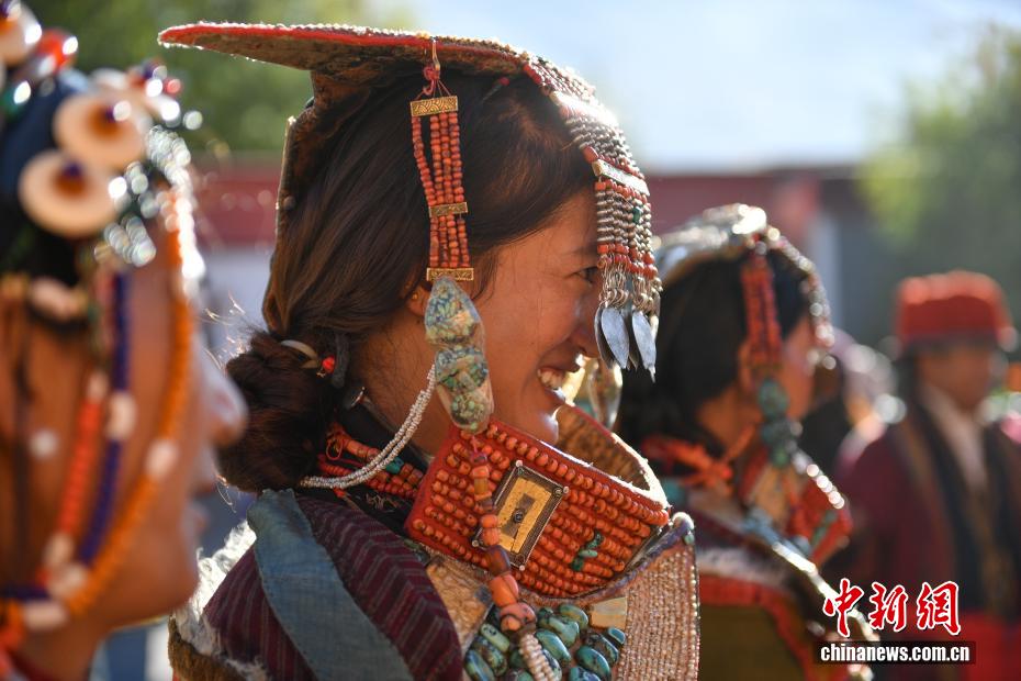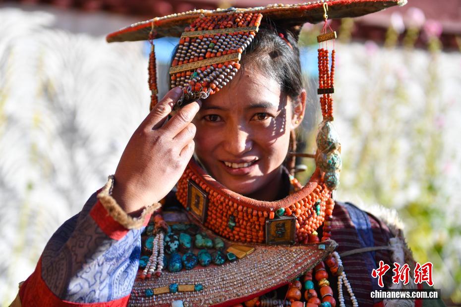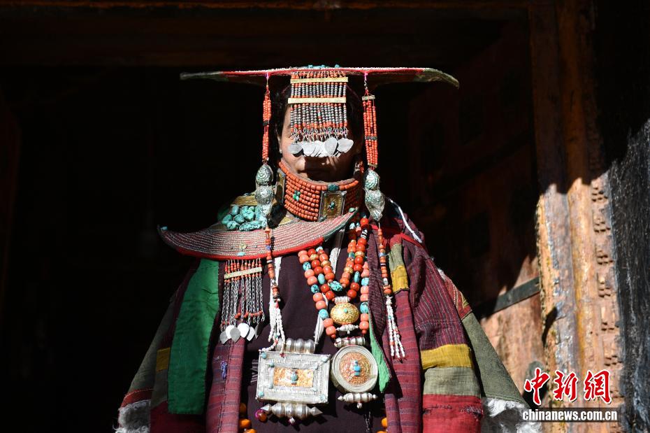 9月23日,西藏自治區(qū)阿里地區(qū)普蘭縣,至今保留著獨(dú)特的藏族服飾——普蘭服飾,它是中國(guó)國(guó)家級(jí)非物質(zhì)文化遺產(chǎn)。普蘭服飾已有1000多年的歷史,其中最精美、最獨(dú)特的是婦女的“孔雀服飾”,普蘭縣科迦村里有7戶人家保存著7套祖?zhèn)鞣?,一套重達(dá)20多公斤,裝飾有黃金、白銀、松石、瑪瑙、珊瑚、珍珠等,承載和沉淀了百年時(shí)光,堪稱(chēng)“穿在身上的千年史”。時(shí)至今日,這種美麗的服飾文化還在當(dāng)?shù)貍鞒兄D為西藏阿里地區(qū)普蘭縣科迦村,村民在展示普蘭服飾。貢確 攝