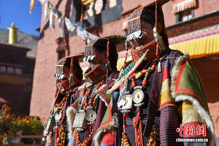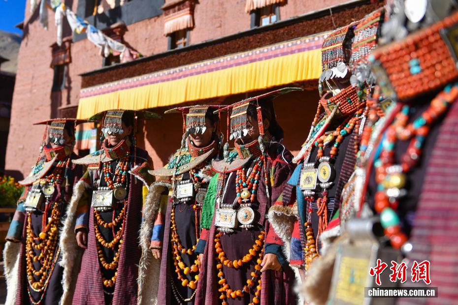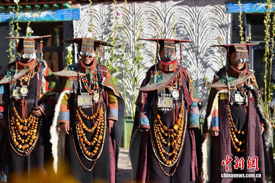 9月23日,西藏自治區(qū)阿里地區(qū)普蘭縣,至今保留著獨(dú)特的藏族服飾——普蘭服飾,它是中國(guó)國(guó)家級(jí)非物質(zhì)文化遺產(chǎn)。普蘭服飾已有1000多年的歷史,其中最精美、最獨(dú)特的是婦女的“孔雀服飾”,普蘭縣科迦村里有7戶人家保存著7套祖?zhèn)鞣棧惶字剡_(dá)20多公斤,裝飾有黃金、白銀、松石、瑪瑙、珊瑚、珍珠等,承載和沉淀了百年時(shí)光,堪稱(chēng)“穿在身上的千年史”。時(shí)至今日,這種美麗的服飾文化還在當(dāng)?shù)貍鞒兄?。圖為西藏阿里地區(qū)普蘭縣科迦村,村民在展示普蘭服飾。貢確 攝