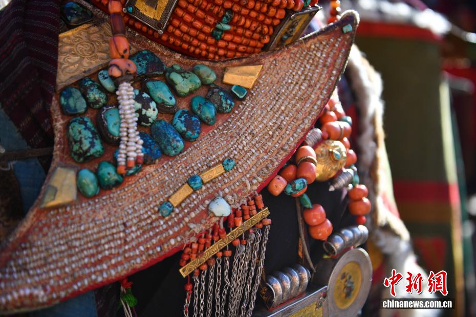 9月23日,西藏自治區(qū)阿里地區(qū)普蘭縣,至今保留著獨(dú)特的藏族服飾——普蘭服飾,它是中國(guó)國(guó)家級(jí)非物質(zhì)文化遺產(chǎn)。普蘭服飾已有1000多年的歷史,其中最精美、最獨(dú)特的是婦女的“孔雀服飾”,普蘭縣科迦村里有7戶人家保存著7套祖?zhèn)鞣?,一套重達(dá)20多公斤,裝飾有黃金、白銀、松石、瑪瑙、珊瑚、珍珠等,承載和沉淀了百年時(shí)光,堪稱(chēng)“穿在身上的千年史”。時(shí)至今日,這種美麗的服飾文化還在當(dāng)?shù)貍鞒兄?。圖為普蘭服飾細(xì)節(jié)展示。貢確 攝