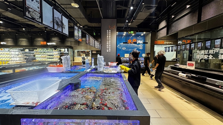肉禽區(qū)在保留原有優(yōu)質(zhì)商品基礎(chǔ)上,新增黑豬系列冷鮮肉、品牌冷鮮進(jìn)口牛肉、原切牛排等高品質(zhì)商品,同時引入藏香豬冷鮮肉、牦牛肉、本地藏雞蛋等特色商品。海鮮區(qū)域在保留本地淡水魚的基礎(chǔ)上,加大明蝦、鮑魚、扇貝等大海鮮的占比,同時帝王蟹、波龍、面包蟹、珍寶蟹組成“進(jìn)口四大金剛”,滿足顧客對高端海鮮的需求。針對季節(jié)需求,還推出優(yōu)質(zhì)大閘蟹等時令商品,滿足消費(fèi)者對優(yōu)質(zhì)蛋白的需求。