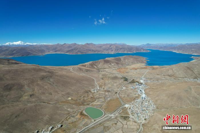 10月25日,西藏山南羊卓雍錯東北岸東拉鄉(xiāng)沿線風光,遠處雪山皚皚。(無人機畫面)中新社記者 江飛波 攝