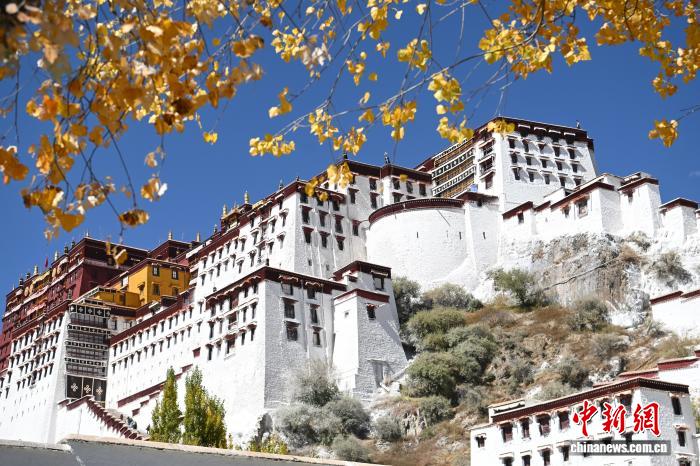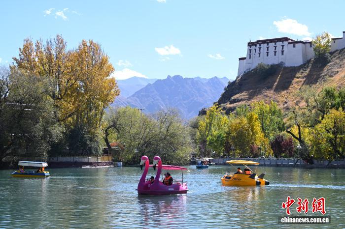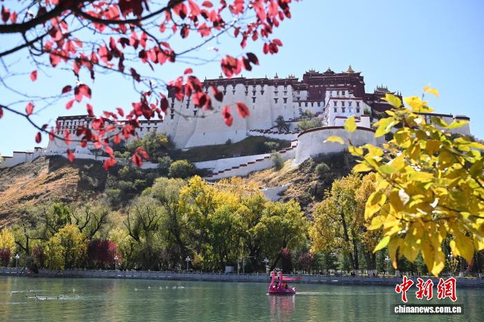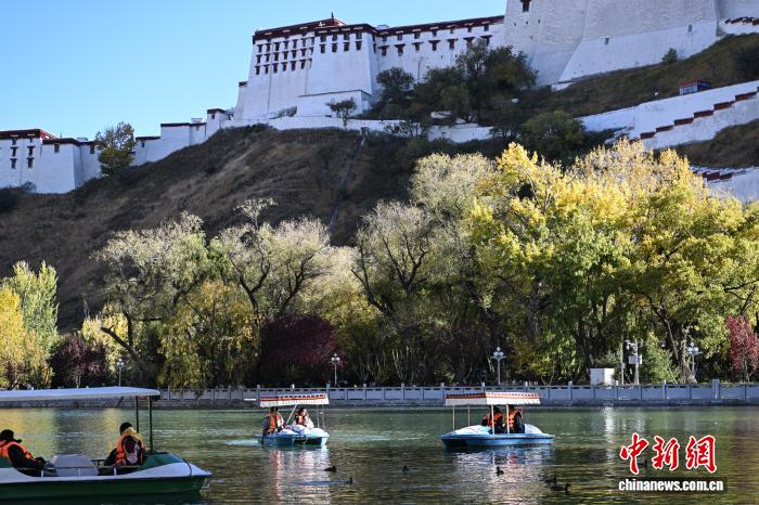 10月25日,金秋時(shí)節(jié),西藏拉薩市宗角祿康公園進(jìn)入最佳觀賞期。人工湖畔楊樹、柳樹褪去翠綠,換上金黃與橙紅的盛裝,倒映在澄澈湖水中,與布達(dá)拉宮的紅墻白宮相映成趣。中新社記者 貢嘎來松 攝