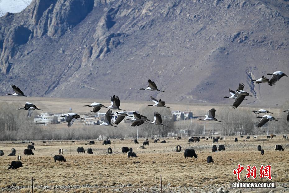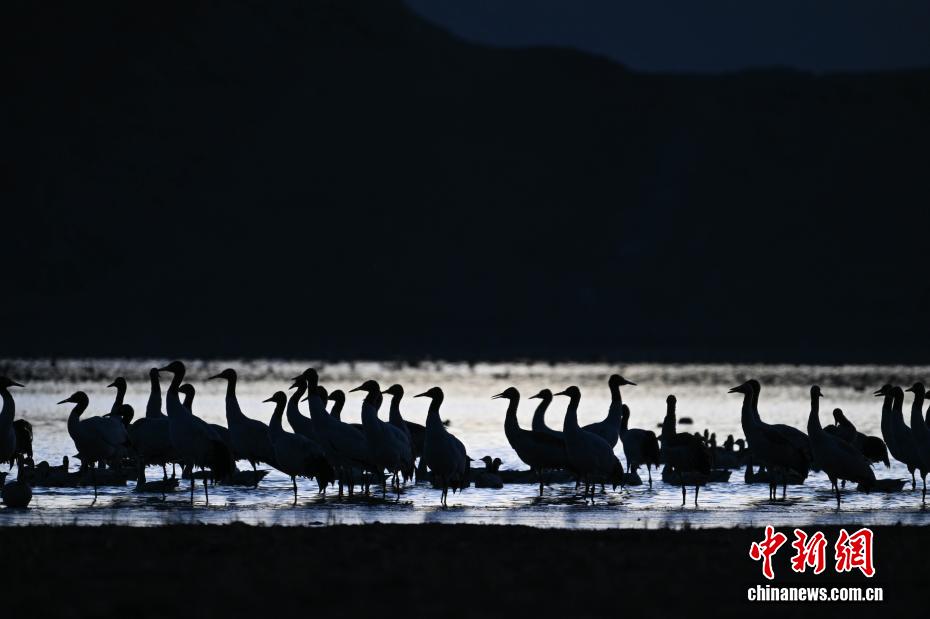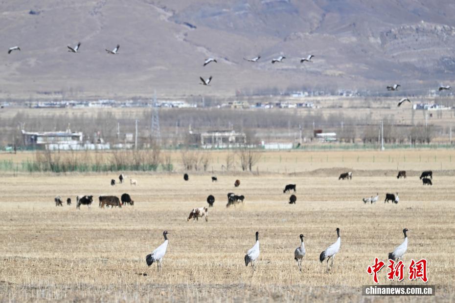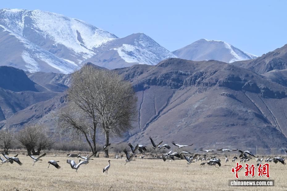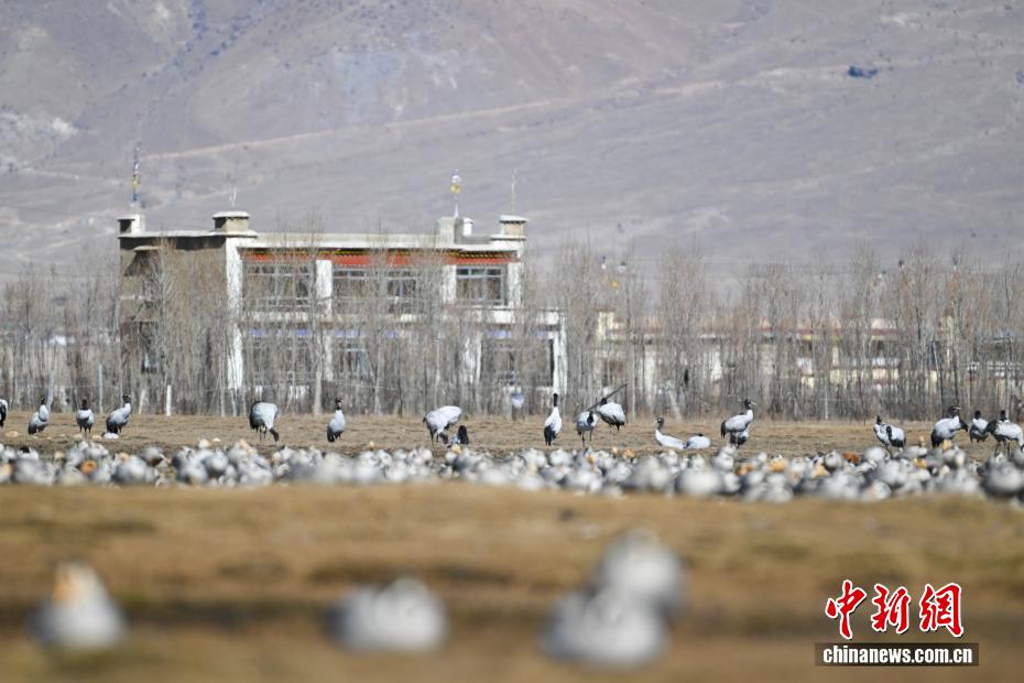 11月26日,位于西藏自治區(qū)拉薩市林周縣的黑頸鶴自然保護區(qū)內(nèi),大量越冬的黑頸鶴在卡孜水庫、農(nóng)田、濕地里覓食、嬉戲。林周縣位于拉薩河上游及澎波河流域,是黑頸鶴的主要越冬地之一。中新社記者 貢嘎來松 攝