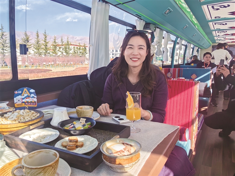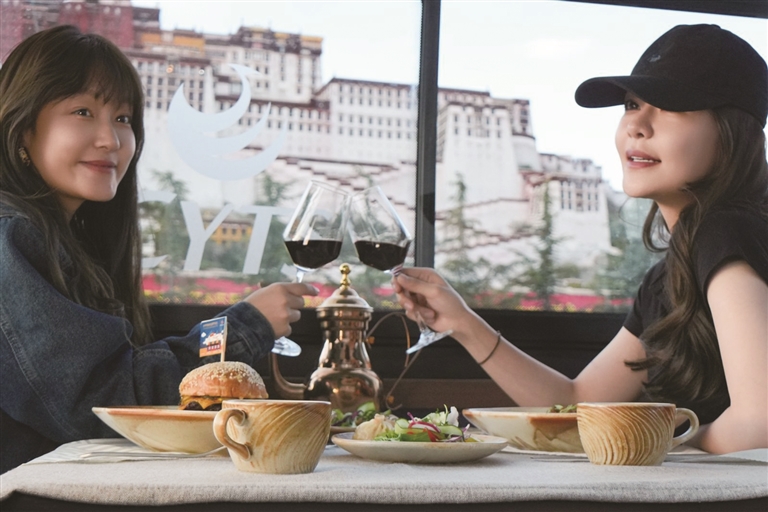 為了讓游客和市民能夠品嘗到最地道的拉薩美食,觀光巴士運(yùn)營方與拉薩多家知名餐廳展開了深度合作。乘車期間,游客可以圍爐煮茶,感受那份溫馨與愜意,品嘗果茶的清甜、干果的香脆與甜品的綿密交織在口中的美妙滋味;還可以喝上一杯用高原牦牛奶與醇厚紅茶小火慢熬而成的甜茶,搭配上融合藏式元素的精致茶點(diǎn),仿佛瞬間穿越到了拉薩當(dāng)?shù)厝说纳钪校两襟w驗他們的悠閑午后時光。