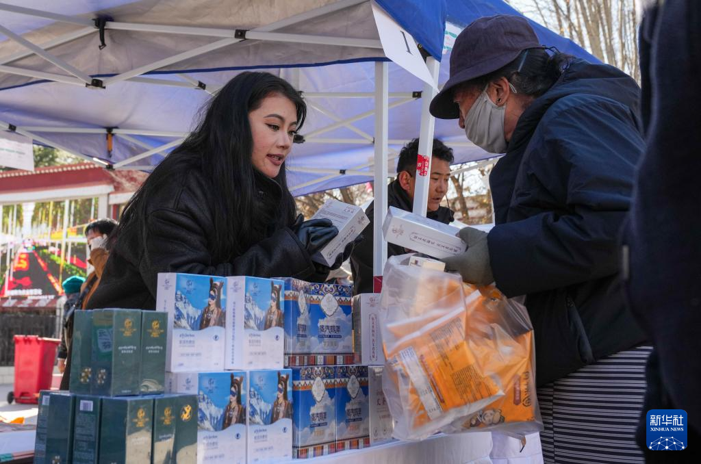 12月10日,商戶在拉薩市宗角祿康公園的供銷大集上向顧客介紹商品。新華社記者 晉美多吉 攝