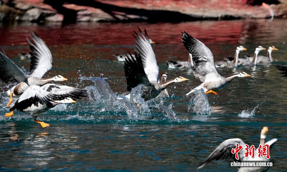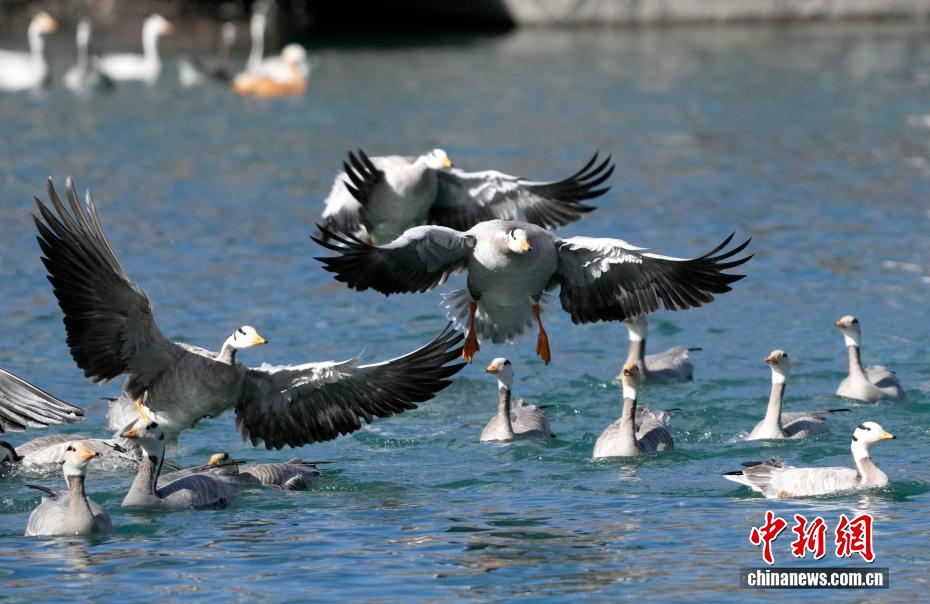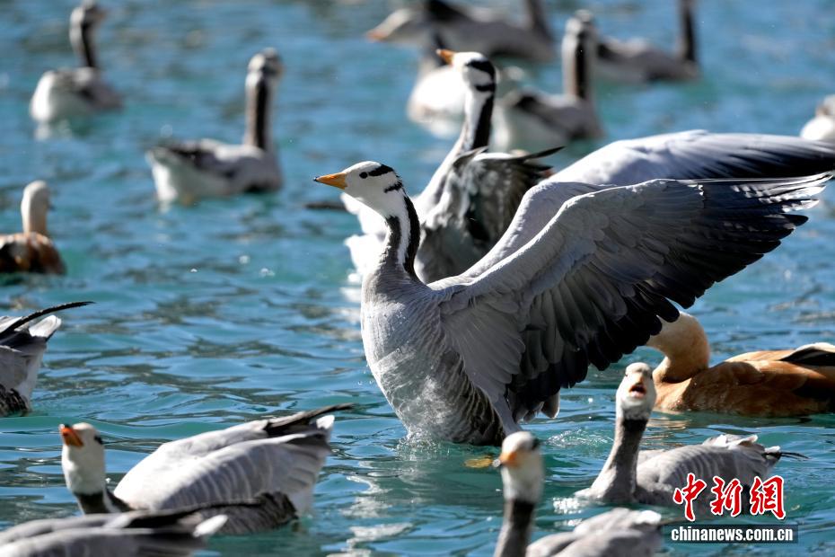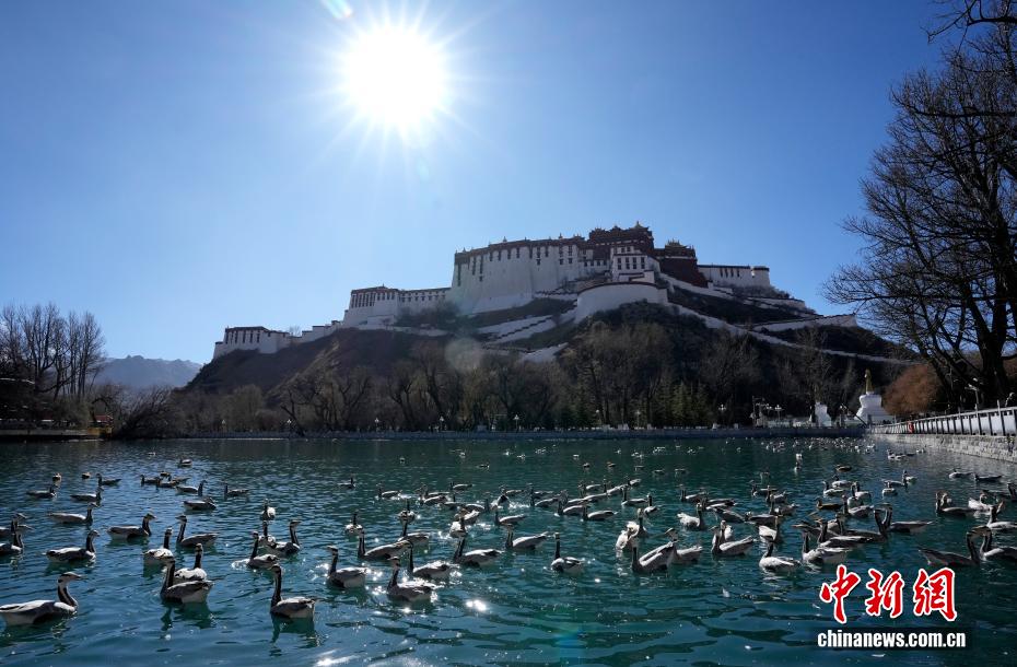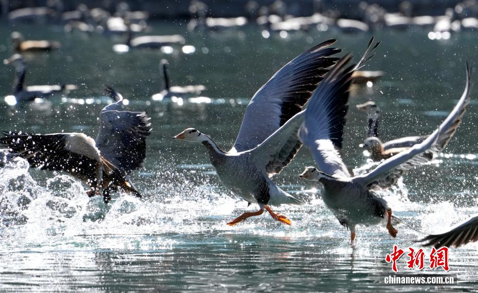12月17日,西藏拉薩市區(qū)宗角祿康公園,大批斑頭雁“集結(jié)”越冬。成群結(jié)隊(duì)的斑頭雁等越冬候鳥(niǎo)吸引市民游客駐足觀賞、拍照留念。圖為宗角祿康公園越冬的斑頭雁。