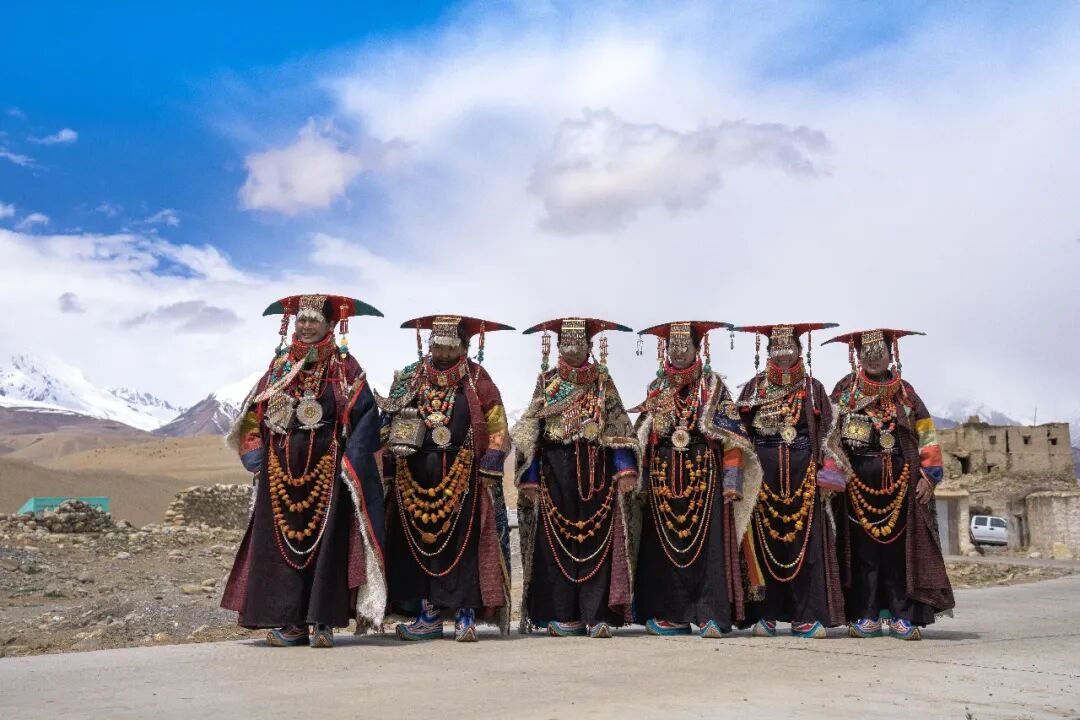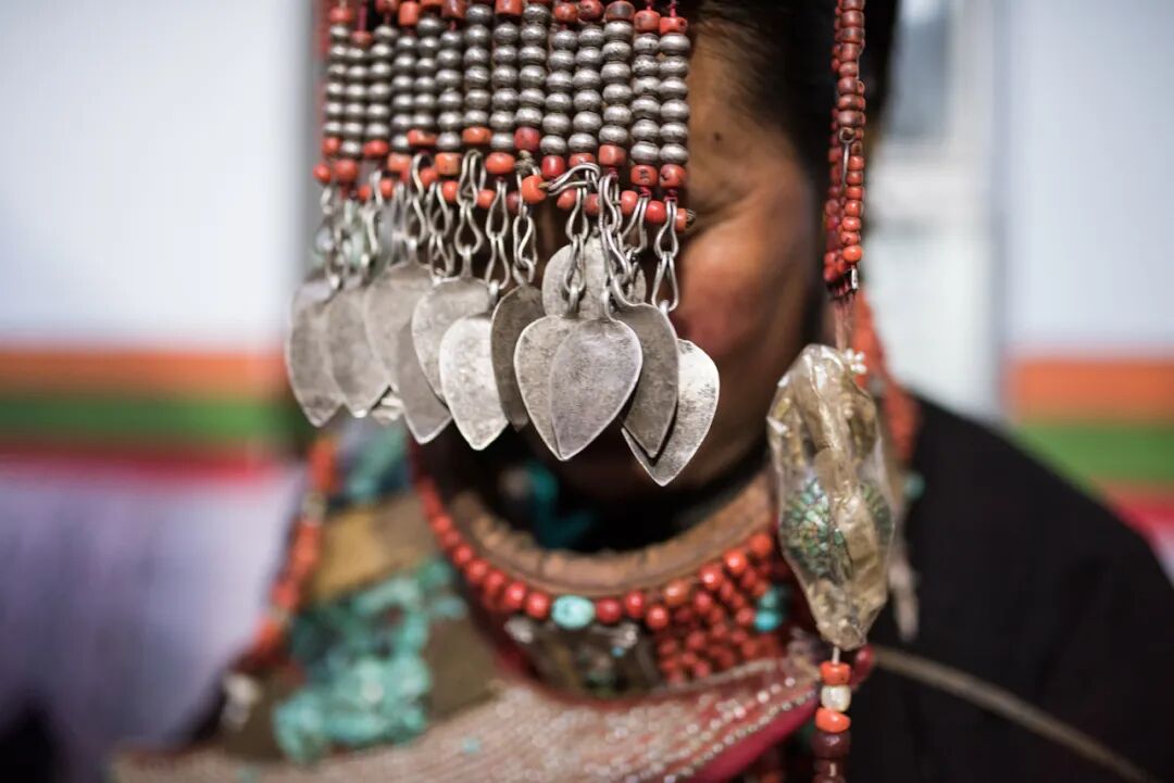 這些服飾上的花紋、顏色和裝飾品都有特定寓意,記錄著普蘭悠久的歷史和與周邊地區(qū)的文化交流,被譽為“穿在身上的史詩”。這套服飾雍容華貴,單是穿戴就要一個多小時。地處貿(mào)易要道的普蘭人,將遙遠(yuǎn)的珊瑚、黃金、蜜蠟、白銀、綠松石、珍珠全都裝飾在“宣”服上,展示著對這襲錦袍的無比珍視。