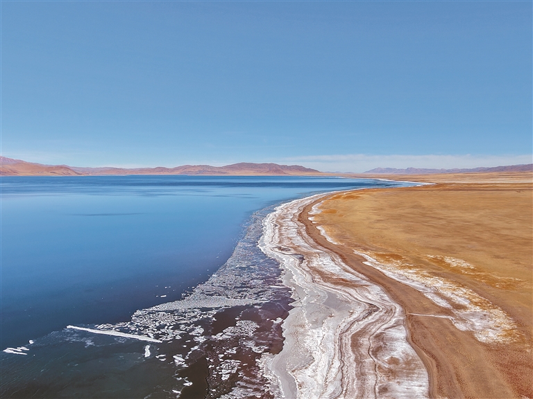 下午,色林錯出現(xiàn)在地平線上。起初只是天邊的一線藍,隨著車隊臨近,眼前一片浩瀚的冰水交響之境——西藏最大的咸水湖,總面積超過2200平方公里。