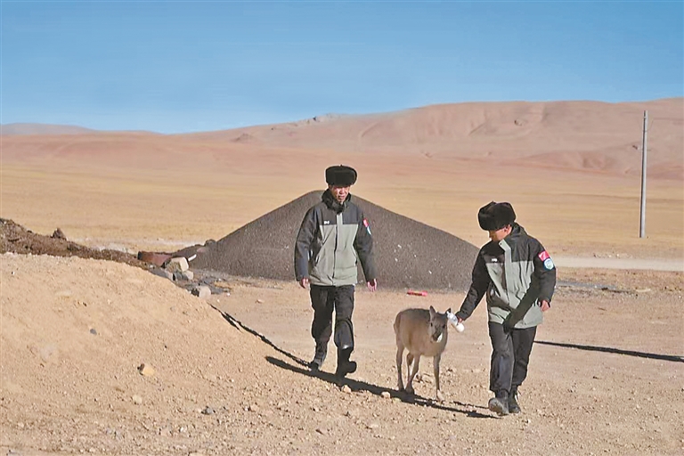 圖為雄熱管護(hù)站管護(hù)員及救助的小藏羚羊。記者 萬(wàn)靖 攝