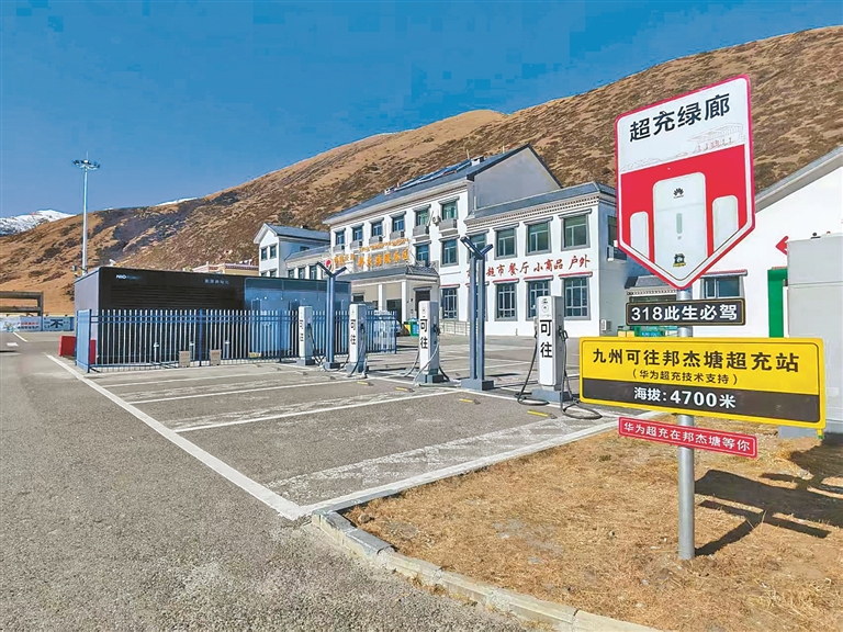 邦杰塘服務(wù)區(qū)停車場(chǎng)內(nèi)的新能源汽車快充樁。通訊員 張成 多吉 攝