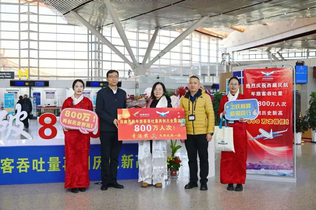圖為當(dāng)天在拉薩貢嘎國際機場抽取了第800萬名的幸運旅客與工作人員合影