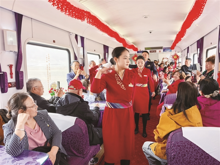 針對高原旅游特殊性及“銀發(fā)族”為主的客群特點(diǎn),中國鐵路青藏集團(tuán)有限公司持續(xù)升級(jí)服務(wù)保障體系,讓旅途兼具安全性與舒適度。車輛方面,該公司完成適老化與舒適化改造,打造2組普惠型旅游專用車組,入藏專列均采用全列有氧臥鋪車廂,配備彌散式供氧系統(tǒng)、專用發(fā)電車及精品餐車,有效緩解旅客高原反應(yīng)。服務(wù)方面,該公司組建“導(dǎo)游+乘務(wù)+醫(yī)護(hù)”三位一體復(fù)合型服務(wù)團(tuán)隊(duì),全程提供健康監(jiān)測、文化講解、應(yīng)急保障等全流程陪伴服務(wù);車廂內(nèi)以民族紋飾、剪紙窗花營造地域氛圍,文藝小分隊(duì)沿途獻(xiàn)上藏族歌曲、舞蹈等特色表演,餐車則供應(yīng)烤羊腿、牦牛酸奶、特色奶茶等地方風(fēng)味美食,讓旅程更加舒適美好。運(yùn)營模式上,該公司采用“晚上開行、白天游玩、邊走邊?!钡脑O(shè)計(jì),途經(jīng)玉珠峰、沱沱河、羌塘草原等高原奇景,在海拔5072米的唐古拉站、措那湖等標(biāo)志性地點(diǎn)定點(diǎn)??浚層慰驮谛菹⒅锌缭缴胶?,充分領(lǐng)略雪域風(fēng)光。同時(shí),該公司強(qiáng)化公鐵聯(lián)運(yùn)與景區(qū)接駁,推出“旅游小管家”一站式服務(wù),確保游客“行得順暢、吃得地道、玩得盡興”。