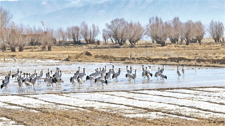 “每年10月底開始,黑頸鶴就從北方飛來(lái)越冬?!毖沧o(hù)員嘎旦仁增告訴記者,“這幾年保護(hù)力度加大,棲息環(huán)境更好了,來(lái)過(guò)冬的黑頸鶴一年比一年多。”
