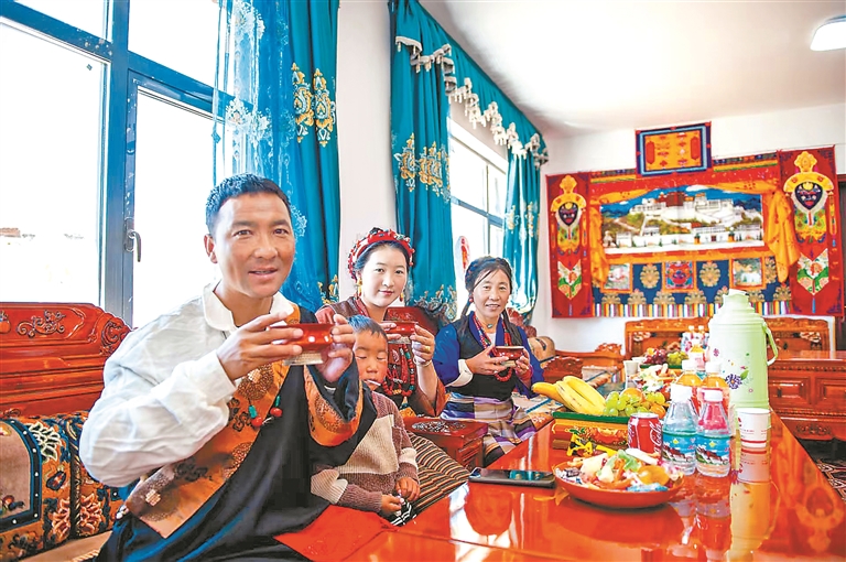圖為定結(jié)縣乃村村民在喝新房里的第一杯酥油茶。記者 旦增嘎瓦 攝