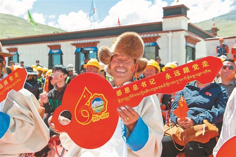 2025年8月15日,定日地震災(zāi)后恢復(fù)重建首批民房入住儀式現(xiàn)場,群眾代表拿到新居“鑰匙”。西藏日報(bào)記者 旦增嘎瓦 攝
